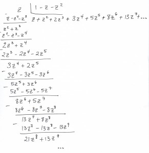 on obtient une nouvelle expression pour la fonction \(f\), une forme fermée de \(f\) \[f(z) = \frac{z}{1-z-z^{2}}\]Avant de continuer, une petite division avec crochet fort distrayante illustre de belle manière cette dernière égalité