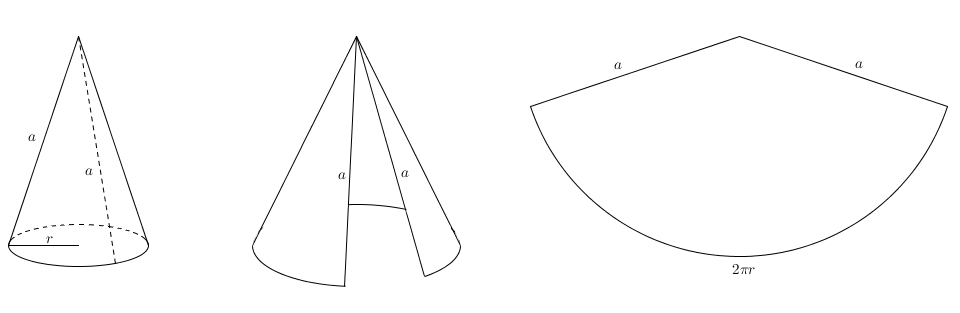 On peut aussi découper le cône et le mettre à plat : on obtient un secteur de disque. On remarque que l’apothème du cône devient le rayon du grand disque et la circonférence de la base du cône devient l’arc de cercle du secteur. L’aire de ce secteur est proportionnel à la mesure de l’arc. Comme l’aire totale du disque complet est \(\pi a^{2}\), la circonférence est \(2\pi a\) et la mesure de l’arc est \(2\pi r\), on obtient\[\frac{\text{Aire du secteur}}{\pi a^{2}}=\frac{2\pi r}{2\pi a}\]ce qui fait après une simplification à droite \[\frac{\text{Aire du secteur}}{\pi a^{2}} = \frac{r}{a}\]puis en multipliant chaque côté par \(\pi a^{2}\) \[\text{Aire du secteur} = \pi a r\]Mais comme ce secteur correspond exactement à la surface latérale du cône, on a en réalité trouvé quelque chose d’assez extraordinaire \[\text{Aire latérale du cône} = \pi a r\]On s’intéresse enfin à un autre solide apparenté : le cône tronqué (et où est la σφαίρα dans tout ça ? Patience…)