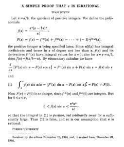 [3] Voici la preuve originale d’Ivan Niven parue dans le Bulletin of American Mathematical Society 53 (1947), 509.