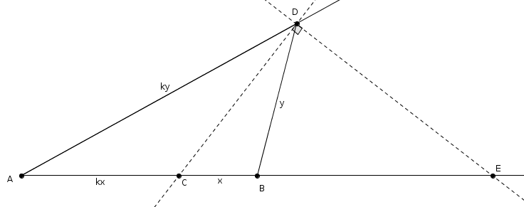 qui satisfasse la même condition.\[m\overline{DA}\ = \ k\cdot \overline{DB}\]Le théorème de la bissectrice nous indique que la bissectrice (ici, intérieure) de l’angle \(D\) partage le côté opposé dans le rapport des côtés de l’angle. Or, c’est exactement ce qu’on a ici, si bien que la bissectrice (intérieure) de l’angle \(D\) passe par \(C\).