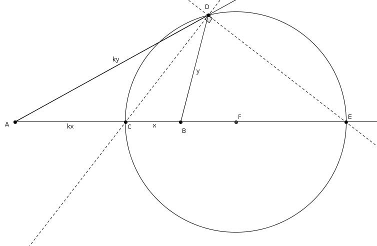 On peut aborder le problème de manière encore plus générale. Quel est le lieu de points \(P\) tel que le rapport des distances entre le point \(P\) et les points \(A\) et \(B\) soit constant ? En d’autres mots, on cherche le lieu de points \(P\) tel que\[\frac{m\overline{PA}}{m\overline{PB}}\ = \ k\]ou de la même manière\[m\overline{PA}\ = \ k\cdot m\overline{PB}\]avec \(A\) et \(B\) donnés. La solution est triviale si \(k=1\) puisque le lieu de points est tout simplement la médiatrice de \(AB\). Si \(k\neq 1\), cependant, la solution est diablement moins évidente. Voyons. On peut toujours trouver un point \(C\) sur \(\overline{AB}\) qui satisfasse ladite condition.