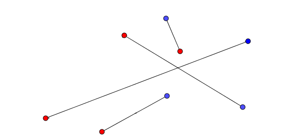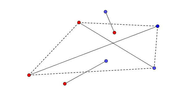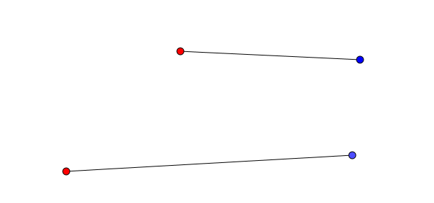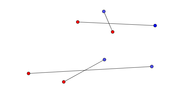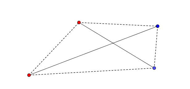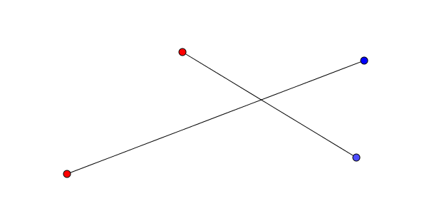 En d’autres mots, même en laissant tomber l’idée de boucle, il n’est même pas possible de jouer tous les dominos pour former une longue chaîne. En fait, le seul jeu de dominos avec un nombre de points impairs dans lequel une telle chaîne serait possible serait représenté par un graphe à deux sommets : \(0\) et \(1\).