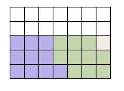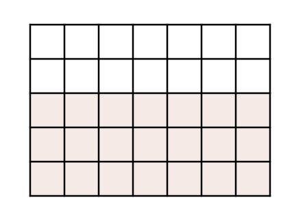 Chaque part représente \(\frac{1}{5}\) de l’entier, il y a \(3\) parts. Il est difficile de voir combien de paquets de \(2\) parts on peut faire car ces parts sont de tailles différentes ; dans ce cas-ci, on voudrait faire des paquets de \(2\) parts de \(\frac{1}{7}\) alors que les morceaux à notre disposition sont de \(\frac{1}{5}\). Solution ? Chercher des morceaux de la même taille. Cela revient, bien sûr, à trouver un dénominateur commun. Ici, si on divise chaque morceau en sept parts, on obtient \(35\) parts dans l’entier.