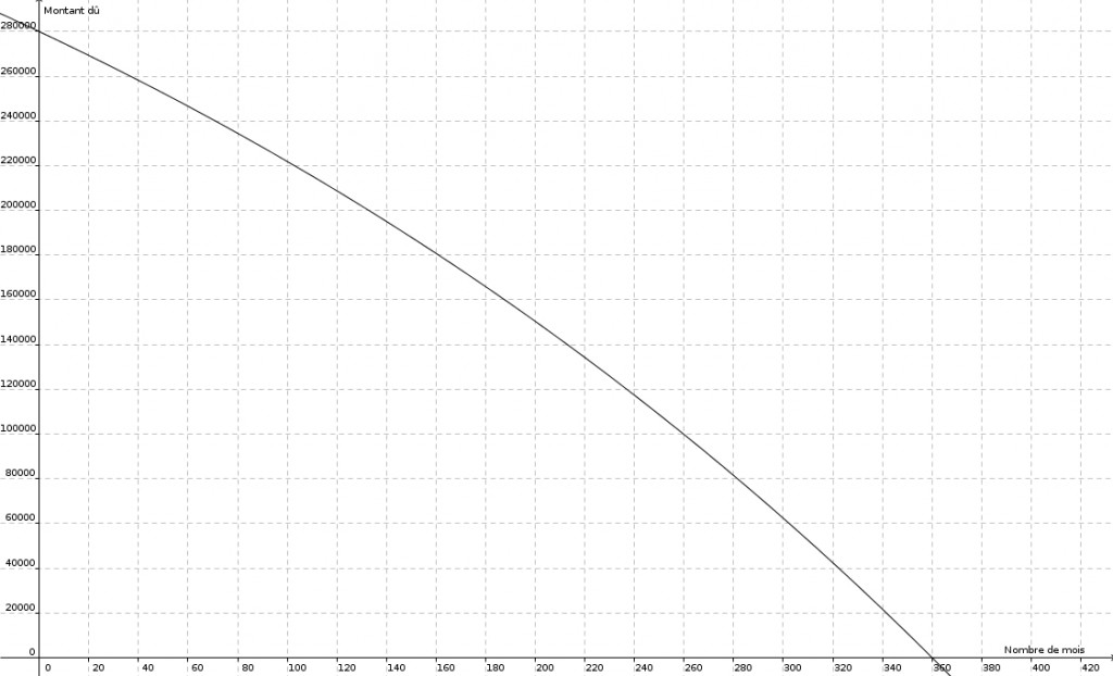 Au départ on a tout simplement \[f(0) = C_{0}\]Après un premier calcul des intérêts, \(\left(1 +\frac{i}{n}\right)\), on rembourse un montant \(P\). \[f(1) = C_{0}\left(1 + \frac{i}{n}\right)-P\]Au deuxième versement, c’est \[f(2) = \left(C_{0}\left(1 + \frac{i}{n}\right)-P\right)\left(1 + \frac{i}{n}\right)-P\]En distribuant le facteur \(\left(1+\frac{i}{n}\right)\) on obtient \[f(2) = C_{0}\left(1+\frac{i}{n}\right)^{2}-P\left(1 + \frac{i}{n}\right)-P\]Au troisième,\[f(3) = \left(C_{0}\left(1 + \frac{i}{n}\right)^{2}-P\left(1+\frac{i}{n}\right)-P\right)\left(1 + \frac{i}{n}\right)-P\]et encore une fois en distribuant, \[f(3) = C_{0}\left(1+\frac{i}{n}\right)^{3}-P\left(1+\frac{i}{n}\right)^{2}-P\left(1+\frac{i}{n}\right)-P\]Au quatrième calcul des intérêts, \[f(4)=\left(C_{0}\left(1+\frac{i}{n}\right)^{3}-P\left(1+\frac{i}{n}\right)^{2}-P\left(1+\frac{i}{n}\right)-P\right)\left(1+\frac{i}{n}\right)-P\]et en distribuant, \[f(4) = C_{0}\left(1+\frac{i}{n}\right)^{4}-P\left(1+\frac{i}{n}\right)^{3}-P\left(1+\frac{i}{n}\right)^{2}-P\left(1+\frac{i}{n}\right)-P\]Une tendance se dégage. Il apparait de plus en plus clair qu’au \(t\)e calcul des intérêts, on aura \[f(t) = C_{0}\left(1+\frac{i}{n}\right)^{t}-P\left(1+\frac{i}{n}\right)^{t-1}\ – \ \dots \ – \ P\left(1+\frac{i}{n}\right)^{2}-P\left(1+\frac{i}{n}\right)-P\]Une mise en évidence simple de \(-P\) nous donne \[f(t) = C_{0}\left(1+\frac{i}{n}\right)^{t}-P\left(\left(1+\frac{i}{n}\right)^{t-1} \ + \ \dots \ + \ \left(1 + \frac{i}{n}\right)^{2}+\left(1+\frac{i}{n}\right) + 1\right)\]L’expression dans la grande parenthèse est une série géométrique finie de premier terme 1 et de raison (1 + i/n). Nous pouvons exprimer sa somme de façon plus concise. On obtient \[f(t) = C_{0}\left(1+\frac{i}{n}\right)^{t}-P\left(\frac{1-\left(1+\frac{i}{n}\right)^{t}}{1-\left(1+\frac{i}{n}\right)}\right)\]Enfin, une petite simplification nous donne \[f(t)=C_{0}\left(1+\frac{i}{n}\right)^{t}-P\left(\frac{1-\left(1+\frac{i}{n}\right)^{t}}{1-1-\frac{i}{n}}\right)\]puis \[f(t) = C_{0}\left(1+\frac{i}{n}\right)^{t}+P\left(\frac{n}{i}\right)\left(1-\left(1+\frac{i}{n}\right)^{t}\right)\]Voilà donc l’expression recherchée. Maintenant, comment calculer la valeur de \(P\) afin qu’à terme, on ait remboursé la totalité de notre emprunt ? Posons \[f(t) = 0\]On a alors \[C_{0}\left(1+\frac{1}{n}\right)^{t}+P\left(\frac{n}{i}\right)\left(1-\left(1+\frac{i}{n}\right)^{t}\right) = 0\]On soustrait \(C_{0}\left(1+\frac{i}{n}\right)^{t}\)de chaque côté de l’égalité \[P\left(\frac{n}{i}\right)\left(1-\left(1+\frac{i}{n}\right)^{t}\right)=-C_{0}\left(1+\frac{i}{n}\right)^{t}\]puis on divise \[P=\frac{-C_{0}\left(\frac{i}{n}\right)\left(1+\frac{i}{n}\right)^{t}}{1-\left(1+\frac{i}{n}\right)^{t}}\]En multipliant par \(-1\) en haut et en bas, on obtient l’expression légèrement plus élégante suivante \[P= \frac{C_{0}\left(\frac{i}{n}\right)\left(1+\frac{i}{n}\right)^{t}}{\left(1+\frac{i}{n}\right)^{t}-1}\]Cette dernière formule nous donne la valeur de \(P\) en fonction de \(C_{0}\), \(i\), \(n\) et \(t\). Supposons que l’on emprunte \(280\, 000\) dollars sur une période de \(30\) ans à un taux annuel de \(2,\!5\%\), composé chaque mois, le remboursement mensuel s’élèvera à \[P = \frac{280\,000\left(\frac{0,025}{12}\right)\left(1+\frac{0,025}{12}\right)^{(12\cdot 30)}}{\left(1+\frac{0,025}{12}\right)^{(12\cdot 30)}-1} \approx 1\,106,\!34\]Et l’expression \[f(t) = C_{0}\left(1+\frac{i}{n}\right)^{t}+P\left(\frac{n}{i}\right)\left(1-\left(1+\frac{i}{n}\right)^{t}\right)\]ou, de manière équivalente, \[f(t) = \left(C_{0}-P\cdot \left(\frac{n}{i}\right)\right)\cdot\left(1+\frac{i}{n}\right)^{t}+P\cdot\left(\frac{n}{i}\right)\]nous permet alors de représenter graphiquement la situation (le montant dû en fonction du temps)