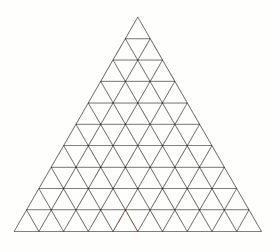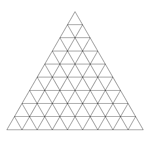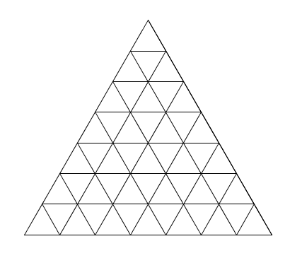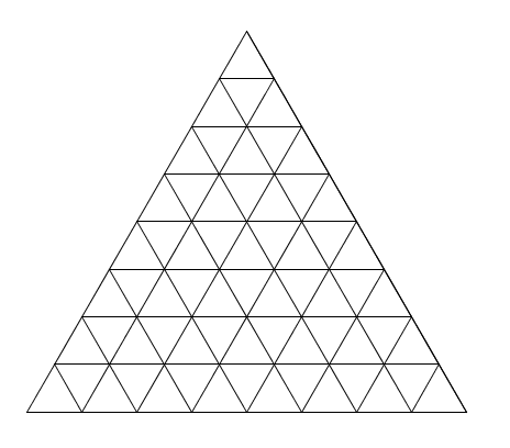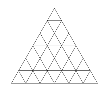 S’il s’est écoulé pas mal de temps avant que j’écrive un nouveau billet, c’est qu’un petit problème génial a occupé une grande partie de mon temps libre. En effet, il se trouve qu’un de mes collègues a une passion pour les mathématiques toute aussi forte que la mienne. Voici le problème qu’il m’a envoyé la semaine dernière. Un problème simple (et connu) mais dont la solution s’avère, on s’en doute, plutôt ardue. Il s’agit de compter le nombre de triangles équilatéraux que l’on retrouve dans un grand triangle équilatéral de côté \(n\).