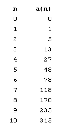 Il suffit maintenant de combiner ces résultats afin d’obtenir \(a(n)\). On a \[a(n) = u(n) + v(n)\]Dans le cas d’un \(n\) pair, on obtient \[a(n) = \frac{n^{3}+3n^{2}+2n}{6}+\frac{2n^{3}+3n^{2}-2n}{24}\]ce qui fait, en mettant sur dénominateur commun \[a(n) = \frac{4n^{3}+12n^{2}+8n}{24}+\frac{2n^{3}+3n^{2}-2n}{24}\]puis en regroupant les termes semblables \[a(n) = \frac{6n^{3}+15n^{2}+6n}{24}\]Finalement en divisant par \(3\) en haut et en bas, on obtient \[a(n) = \frac{2n^{3}+5n^{2}+2n}{8}\]toujours pour un \(n\) pair. Pour un \(n\) impair on a plutôt \[a(n) = \frac{n^{3}+3n^{2}+2n}{6} + \frac{2n^{3}+3n^{2}-2n-3}{24}\]ce qui fait, en mettant sur dénominateur commun \[a(n) = \frac{4n^{3}+12n^{2}+8n}{24}+\frac{2n^{3}+3n^{2}-2n-3}{24}\]puis en regroupant les termes semblables \[a(n) = \frac{6n^{3}+15n^{2}+6n-3}{24}\]Finalement, en divisant par \(3\) en haut et en bas, on obtient \[a(n) = \frac{2n^{3}+5n^{2}+2n-1}{8}\]pour un \(n\) impair.