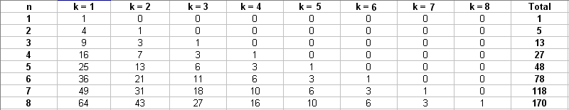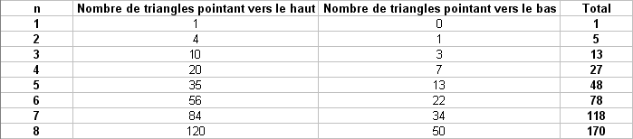 on s’aperçoit qu’il contient \(25\) petits triangles de une unité de côté. Il contient aussi \(13\) plus grands triangles de \(2\) unités de côté (ou composés de \(4\) petits triangles). Il contient \(6\) triangles encore plus grands de \(3\) unités de côté (ou composés de \(9\) petits triangles). Il contient \(3\) grands triangles de quatre unités de côté (ou composés de \(16\) petits triangles) et finalement \(1\) triangle de \(5\) unités de côté (ou composé de \(25\) petits triangles). On obtient bien \[25 + 13 + 6 + 3 + 1 = 48\]Non sans effort, vous pourrez construire le tableau suivant pour les premières valeurs de \(n\) (en comptant séparément les plus petits triangles de côté \(k\)) :