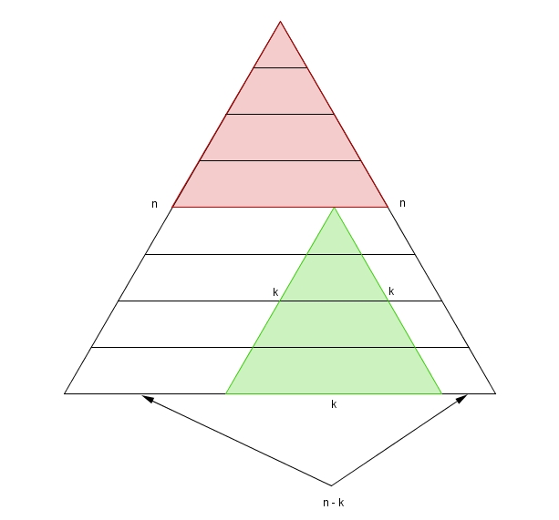 Encore une fois, le sommet du triangle de k unités de côté doit obligatoirement se trouver dans la région rougeâtre sur le schéma. Et, encore une fois, il y a un triangle possible à partir du haut, deux sur l’étage suivant, trois sur celui qui suit, et ce jusqu’au dernier étage. Ici, au dernier étage, il y aura toujours \[n-2k+1\]triangles possibles. Cela signifie que pour un \(k\) et un \(n\) donnés, il y aura donc \[1+2+3+4+ \ \dots \ +(n-2k+1)\]triangles, ce qui se somme à \[\frac{(n-2k+1)(n-2k+1+1)}{2}\]ou plus simplement\[\frac{(n-2k+1)(n-2k+2)}{2}\]Maintenant, quelle est la valeur maximale de \(k\) ? Dans le cas d’un \(n\) pair, il est facile de voir que ce sera \(\frac{n}{2}\). Dans le cas d’un \(n\) impair, ce sera plutôt \(\frac{n-1}{2}\). Voilà où se trouvait la différence entre les \(n\) pairs et impairs pressentie à l’étape préliminaire du dénombrement.