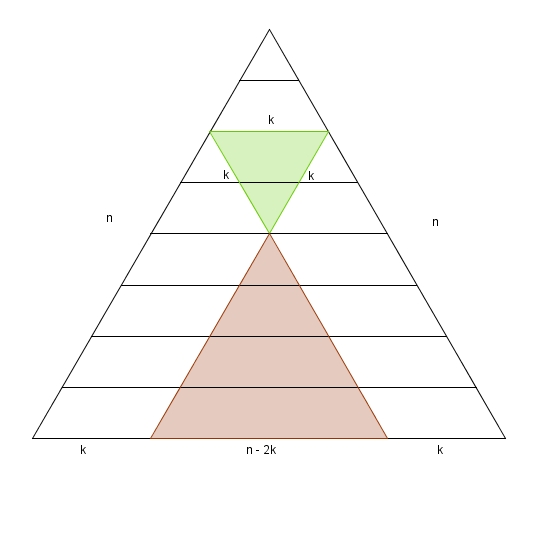 Considérons le petit triangle de côté \(k\) pointant vers le haut dans ce triangle de côté \(n\).