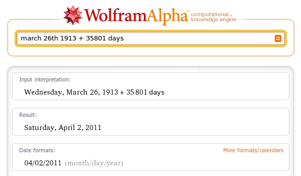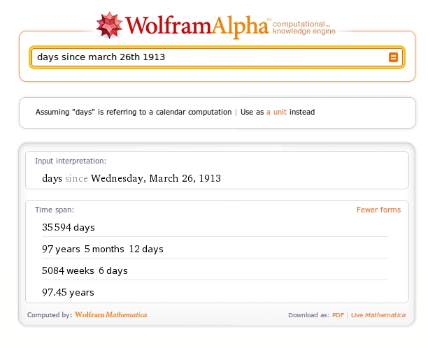 Sur Wolfram | Alpha, entrez “days since [votre date de naissance]”. Pál Erdős, s’il était encore vivant, pourrait entrer :