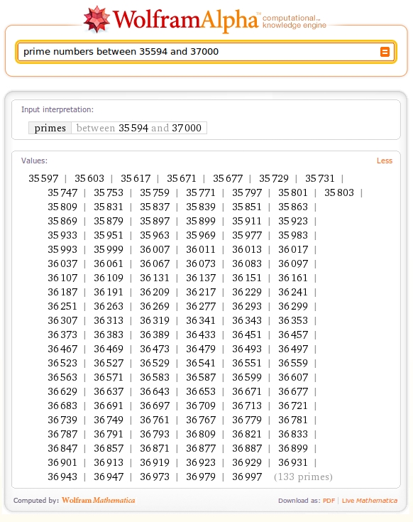 On demande ensuite à Wolfram | Alpha la liste des nombres premiers aux alentours de 35594. On entre “prime numbers between […] and […]”.