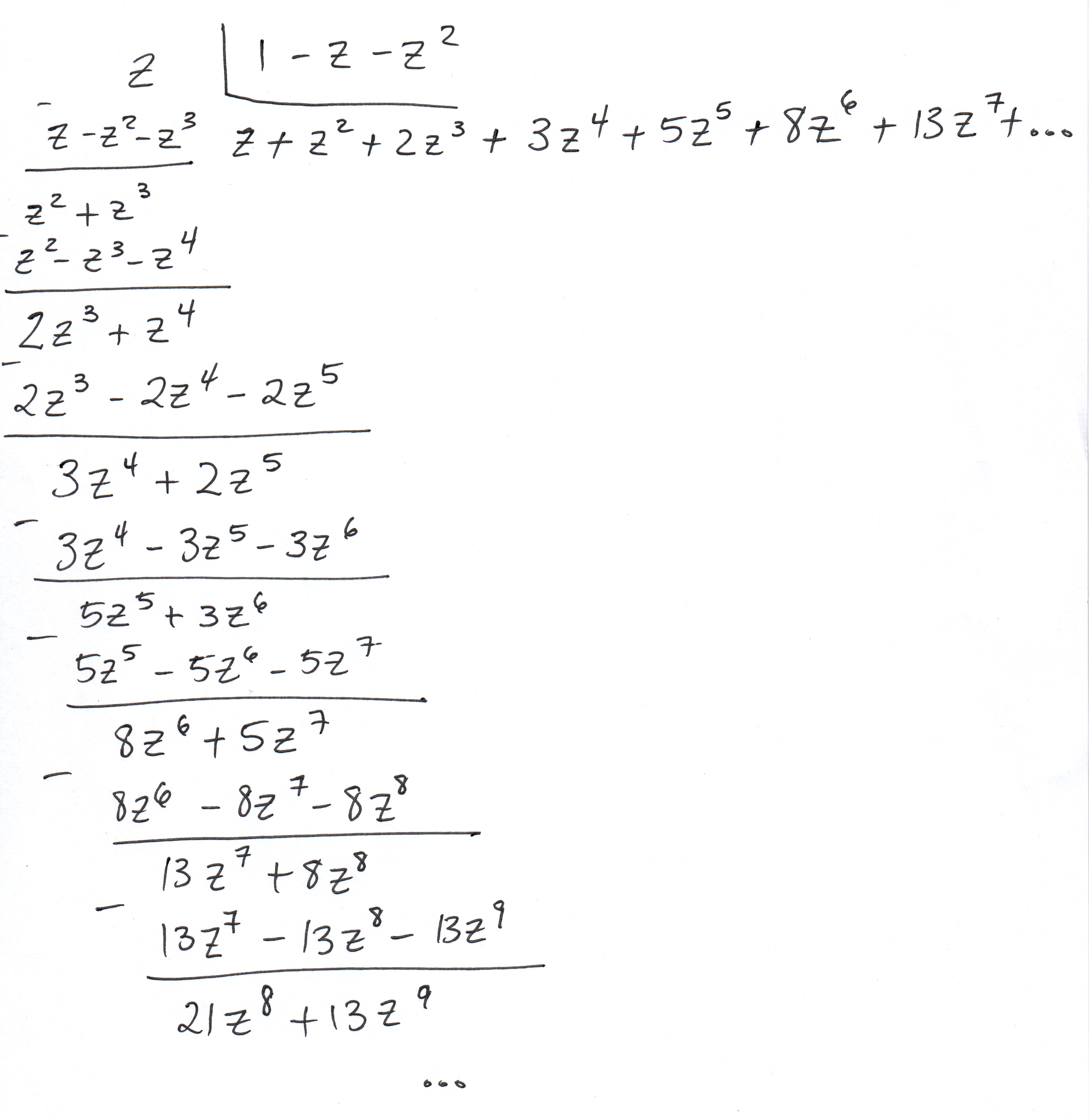 on obtient une nouvelle expression pour la fonction \(f\), une forme fermée de \(f\) \[f(z) = \frac{z}{1-z-z^{2}}\]Avant de continuer, une petite division avec crochet fort distrayante illustre de belle manière cette dernière égalité