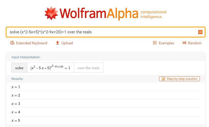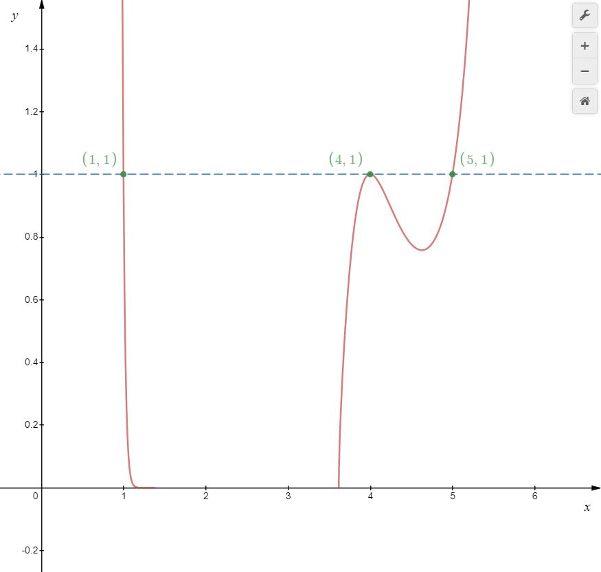 Bien que Desmos et Géogébra semble suggérer le contraire, un cas à traiter a été oublié. Il est possible que la puissance soit \(1\) si la base est \(-1\) et l’exposant est pair. En résolvant \[x^{2}-5x+5=-1\]on obtient \begin{align*}x^{2}-5x+5 &=-1 \\ \\ x^{2}-5x+6 &=0 \\ \\ x^{2}-3x-2x+6&=0 \\ \\ x(x-3)-2(x-3)&=0 \\ \\(x-3)(x-2)&=0\end{align*}Il semble y avoir deux solutions additionnelles \(x=2\) et \(x = 3\). Vérifions si pour ces valeurs l’exposant est pair. Pour \(x=2\), c’est clair puisque les trois termes \[2^{2}-9(2)+20\] sont pairs et pour \(x=3\), \begin{align*}(3)^{2}-9(3)+20 &=9-27+20 \\ \\ &=2\end{align*}on obtient un nombre pair aussi !