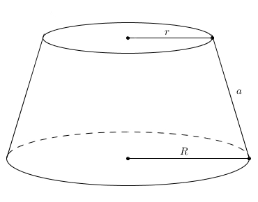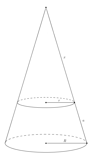 Voilà un cône tronqué dont la petite base a pour rayon \(r\) et la grande, \(R\). On notera \(a\) l’apothème du cône tronqué. Le meilleur moyen de retrouver une expression qui représente l’aire latérale d’un cône tronqué est de restituer le grand cône original.