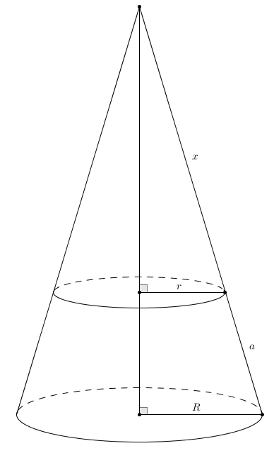 L’apothème de ce grand cône est \(x+a\) et on sait donc que l’aire latérale du grand cône est \[\pi R(x+a)\]Il suffit de soustraire l’aire latérale du cône d’apothème \(x\), celui qu’on enlève pour obtenir le cône tronqué. Son aire latérale étant \(\pi r x\), on obtient comme aire latérale du cône tronqué \begin{align*}\pi R (x+a)-\pi r x &=\pi R x + \pi R a-\pi r x \\ \\ &=\pi\left(Ra + (Rx-rx)\right)\end{align*}Le problème un peu gênant avec cette expression est qu’elle fait intervenir cette quantité fantôme, \(x\), qui ne fait pas partie du cône tronqué du départ. Est-il possible d’exprimer l’aire latérale du cône tronqué avec seulement les quantités du départ, à savoir \(r\), \(R\), et \(a\) ? C’est possible à l’aide de deux triangles semblables qu’on fait apparaître dans le grand cône restitué. Il suffit de tracer la hauteur du grand cône
