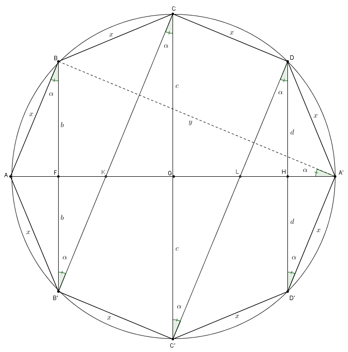 On a plusieurs segments isométriques : \(BF\) et \(B’F\), de longueur \(b\), \(CG\) et \(C’G\), de longueur \(c\) et \(DH\) et \(D’H\), de longueur \(d\). Par ailleurs, comme le polygone est régulier, les cordes \(AB\), \(BC\), \(CD\), etc. sont toutes isométriques et, incidemment, les arcs \(AB\), \(BC\), \(CD\), etc. sont tous isométriques. Plusieurs angles inscrit interceptent donc des arcs isométriques. C’est le cas notamment des angles \(BA’A\), \(ABB’\), \(BB’C\), \(B’CC’\), etc. Tous ces angles sont dénotés sur le schéma par \(\alpha\).