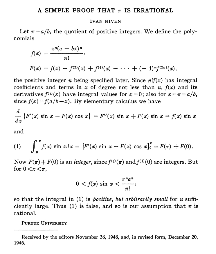 [3] Voici la preuve originale d’Ivan Niven parue dans le Bulletin of American Mathematical Society 53 (1947), 509.