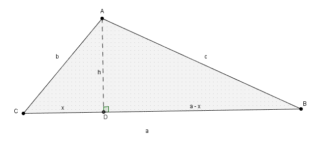 Considérons un triangle quelconque \(ABC\). On trace la hauteur \(\overline{AD}\). Elle tombe perpendiculairement sur \(\overline{CD}\). Appelons \(x\) la mesure du segment \(CD\) et \(a-x\) celle du segment \(BD\). (1)