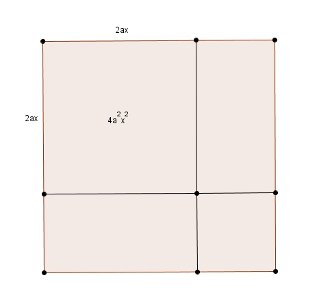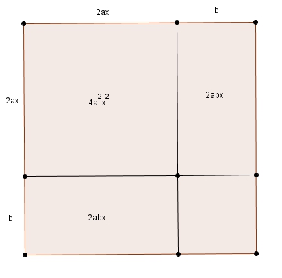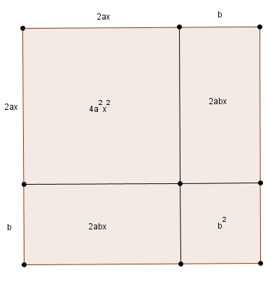 On a \[ax^2 + bx + c = 0\]Afin d’obtenir un carré parfait, on voudrait que le premier terme soit un carré. \(x\) est déjà au carré alors on multipliera chaque terme par \(a\) afin d’obtenir \[a^{2}x^{2}+abx + ac = 0\]On voudrait ensuite que le coefficient du deuxième terme soit pair pour ne pas s’empêtrer inutilement de fractions. On pourrait donc multiplier chaque terme par \(2\). Sauf qu’en multipliant par \(2\), le premier terme ne serait plus un carré. On décide donc de multiplier chaque terme par le plus petit carré pair, c’est-à-dire par \(4\). On obtient \[4a^{2}x^{2}+4abx + 4ac = 0\]Si l’expression de gauche est un carré, alors le premier terme est un carré de côté \(2ax\) tel que représenté dans l’illustration suivante