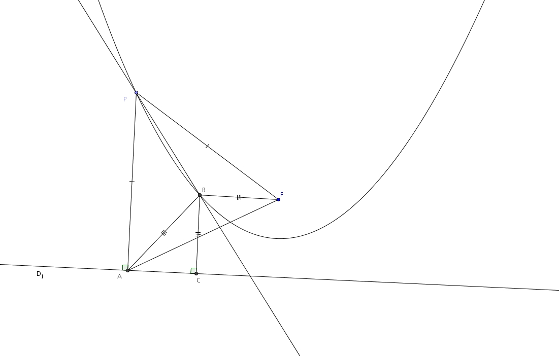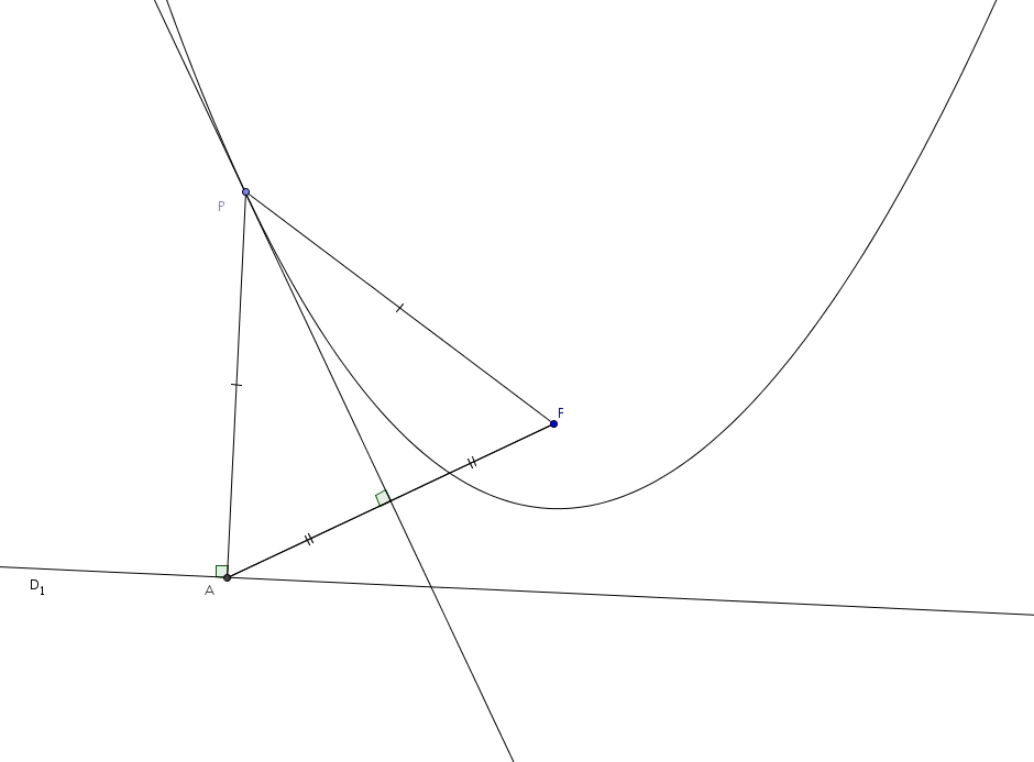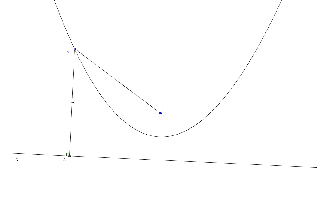Comme tout point de la parabole est équidistant du foyer et de la droite directrice (sa définition usuelle comme lieu de points), on trouve \[\overline{FP}\cong \overline{AP}\](avec, au passage, \(\overline{AP}\) perpendiculaire à \(D_{1}\)).