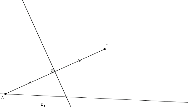 En effet, supposons que la médiatrice de la droite \(AF\) coupe aussi la parabole en \(B\). Comme le point \(B\) est sur la médiatrice, il est à la même distance de \(A\) que de \(F\). On a donc \[\overline{AB}\cong \overline{BF}\]