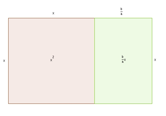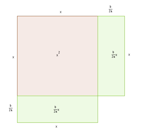 On peut résoudre ces équations, et faire la démonstration de la formule quadratique en « complétant le carré ». Voici donc une telle démonstration avec, en prime, et comme au temps d’Al-Khawarizmi, un support géométrique. On a donc \[ax^{2} + bx + c = 0\]On divise chaque terme par \(a\) \[x^{2}+\frac{b}{a}x+\frac{c}{a}=0\]et on complète le carré : c’est à dire rajouter une quantité qui fera en sorte que les trois premiers termes constituerons un trinôme carré parfait. Évidemment, il faut aussi retrancher immédiatement cette quantité afin de ne pas changer la valeur du polynôme. Quelle est cette quantité ? Les deux premiers termes, étant ceux qui nous intéressent, sont représentés dans l’illustration suivante