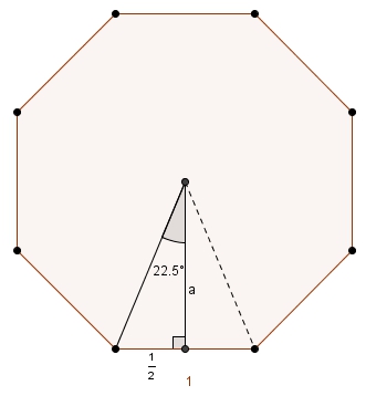 En effet, en utilisant la tangente pour trouver la mesure de l’apothème, c’est facile. Comment faire autrement, avec pour seuls concepts ceux vus en deuxième secondaire ? Ah ! Mais en utilisant un peu de symétrie, on peut se concentrer sur le quart de la figure.