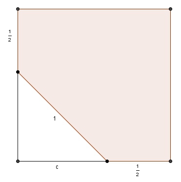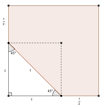 Comment trouver les dimensions du triangle (sans Pythagore) ? On construit un carré en effectuant la réflexion du triangle. Le carré étant un losange, et l’aire des figures étant au programme de deuxième secondaire, on calcule l’aire du carré avec ses diagonales : \[A_{\text{carré}} = \frac{1\times 1}{2} = \frac{1}{2}\]et la mesure du son côté \begin{align*}c^{2}&= \frac{1}{2} \\ \\ \\ c &= \sqrt{\frac{1}{2}} \\ \\ &= \frac{\sqrt{2}}{2}\end{align*}(en deuxième secondaire on utilise la calculatrice ici et on termine avec des valeurs approximatives.) L’aire du grand carré est donc : \[\left(\frac{1+\sqrt{2}}{2}\right)^{2} = \frac{3+2\sqrt{2}}{4}\]On soustrait l’aire du triangle (la moitié de l’aire du carré, c’est-à-dire \(\frac{1}{4}\)) \begin{align*}\frac{3+2\sqrt{2}}{4}-\frac{1}{4} &= \frac{2+2\sqrt{2}}{4} \\ \\ &= \frac{1 + \sqrt{2}}{2}\end{align*}et on multiplie par \(4\) pour obtenir l’aire de l’octogone complet \[\frac{1+\sqrt{2}}{2} \times 4 = 2 + 2\sqrt{2}\]Et voilà !
