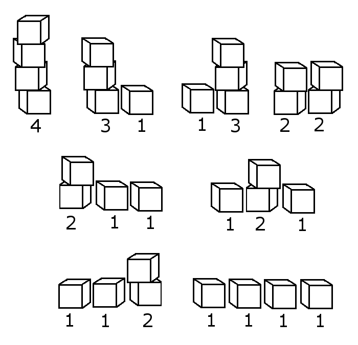 | 4 | 8 | 4 1 + 3 3 + 1 2 + 2 1 + 1 + 2 1 + 2 + 1 2 + 1 + 1 1 + 1 + 1 + 1 |