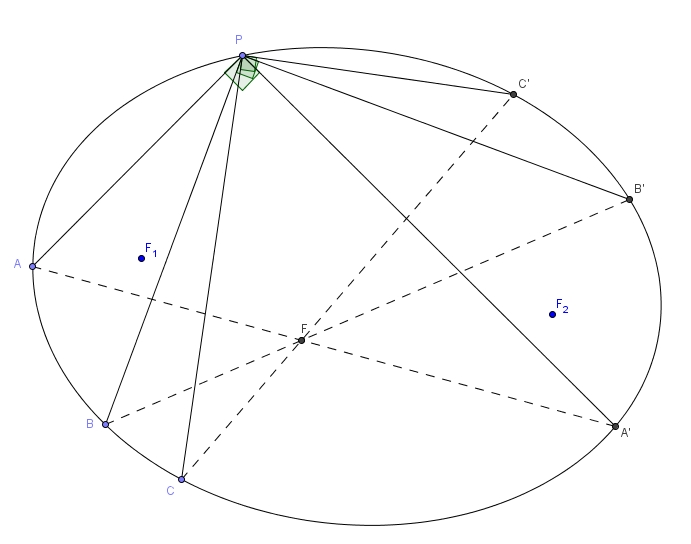 Dans une parabole ou une ellipse, d’un point \(P\), on trace des segments perpendiculaires (angles droits qui ont leur sommet en \(P\)). Les côtés des angles droits coupent la parabole ou l’ellipse. Les segments qui joignent les points d’intersection des angles et de la conique passent tous par \(F\), le point de Frégier.