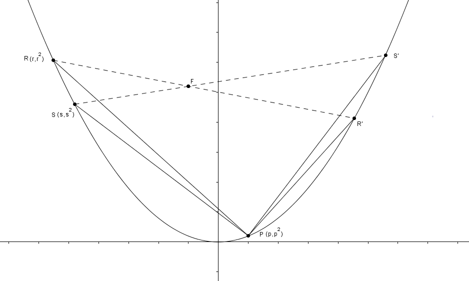 On trouve d’abord l’équation de \(PR\). Sa pente est \[\frac{\Delta y}{\Delta x} = \frac{p^{2}-r^{2}}{p-r}\]Le numérateur se factorise (c’est une différence de carrés) \[\frac{(p-r)(p+r)}{p-r}\]et se simplifie. Il reste donc simplement \[p+r\]La pente de la droite perpendiculaire à \(PR\), soit \(PR^{\prime}\), est l’opposée de l’inverse de la pente de \(PR\), c’est-à-dire \[-\frac{1}{p+r}\]L’équation de \(PR^{\prime}\) est donc de la forme\[y=\left(\!-\frac{1}{p+r}\right)x+b\]pour un certain \(b\).On peut trouver la valeur de \[b=y+\left(\frac{1}{p+r}\right)x\]en remplaçant \(x\) et \(y\) par les coordonnées de \(P\), soit \((p, \, p^{2})\). On obtient\begin{align*}b&=p^{2}+\left(\frac{1}{p+r}\right)p \\ \\ &=p^{2}+\frac{p}{p+r}\end{align*}L’équation de \(PR^{\prime}\) est donc \[y =\left(\!-\frac{1}{p+r}\right)x+p^{2}+\frac{p}{p+r}\]On trouve les coordonnées de \(R^{\prime}\) en résolvant le système d’équations. On sait que l’équation de la parabole est \[y = x^{2}\]ce qui fait \[x^{2}=\left(\!-\frac{1}{p+r}\right)x + p^{2}+\frac{p}{p+r}\]En envoyant tous les termes à gauche, on obtient un trinôme du deuxième degré (en \(x\)) égal à zéro. \[x^{2}+\left(\frac{1}{p+r}\right)x-p^{2}-\frac{p}{p+r}=0\]La formule quadratique nous donnera les solutions (pratique !) Une de ces solutions sera certainement \(x=p\) puisque la droite \(PR^{\prime}\) croise la parabole en \(P\). L’autre solution sera l’abscisse de \(R^{\prime}\). Le calcul du discriminant \[\left(\frac{1}{p+r}\right)^{2}-4(1)\left(-p^{2}-\frac{p}{p+r}\right)\]donne \[\frac{1}{(p+r)^{2}}+4p^{2}+\frac{4p}{p+r}\]En mettant sur dénominateur commun, on obtient \[\frac{1}{(p+r)^{2}}+\frac{4p^{2}(p+r)^{2}}{(p+r)^{2}}+\frac{4p(p+r)}{(p+r)^{2}}\]et donc \[\frac{4p^{2}(p+r)^{2}+4p(p+r)+1}{(p+r)^{2}}\]Le numérateur est un trinôme carré parfait de la forme \[(\alpha + \beta)^{2}=\alpha^{2}+2\alpha\beta + \beta^{2}\]qui se factorise en posant \[\alpha = 2p(p+r)\]et\[\beta =1 \]On obtient donc\[\frac{(2p(p+r)+1)^{2}}{(p+r)^{2}}\]que l’on peut aussi écrire en distribuant \(2p\) dans la parenthèse \[\frac{(2p^{2}+2pr+1)^{2}}{(p+r)^{2}}\]La formule quadratique nous donne donc \[x = \frac{1}{2}\left(-\frac{1}{p+r}\pm\sqrt{\frac{(2p^{2}+2pr+1)^{2}}{(p+r)^{2}}}\right)\]En extrayant la racine carrée, on obtient \[x = \frac{1}{2}\left(-\frac{1}{p+r}\pm\frac{2p^{2}+2pr+1}{p+r}\right)\]ce qui fait \[x = \frac{-1\pm(2p^2+2pr+1)}{2(p+r)}\]Si on considère la première solution, on a \[x_{1}=\frac{-1+2p^{2}+2pr+1}{2(p+r)}\]ce qui fait \[x_{1}=\frac{2p^{2}+2pr}{2(p+r)}\]Et après mise en évidence \[x_{1}=\frac{2p(p+r)}{2(p+r)}\]et simplification des facteurs, on obtient le résultat attendu, à savoir l’abscisse de \(P\). \[x_{1}=p\]C’est l’autre solution qui nous intéresse, l’abscisse de \(R^{\prime}\) \[x_{2}=\frac{-1-2p^{2}-2pr-1}{2(p+r)}\]qui fait \[x_{2}=\frac{-2p^{2}-2pr-2}{2(p+r)}\]Après mise en évidence de \(-2\) \[x_{2}=\frac{-2(p^{2}+pr+1)}{2(p+r)}\]et simplification, on obtient \[x_{2}=\frac{-(p^{2}+pr+1)}{p+r}\]Voilà ! Les coordonnées de \(R^{\prime}\) sont donc \[\left(\frac{-(p^{2}+pr+1)}{p+r}, \ \left(\frac{-(p^{2}+pr+1)}{p+r}\right)^{2}\right)\]Il n’est pas surprenant que les coordonnées de \(R^{\prime}\) dépendent de celles de \(P\) et de \(R\). Trouvons l’équation de \(RR^{\prime}\). La pente de \(RR^{\prime}\) est \[\frac{\Delta y}{\Delta x} = \frac{\left(\frac{-(p^{2}+pr+1)}{p+r}\right)^{2}-r^{2}}{\frac{-(p^{2}+pr+1)}{p+r}-r}\]Le numérateur étant une différence de carrés, on le factorise \[\frac{\left(\frac{-(p^{2}+pr+1)}{p+r}-r\right)\left(\frac{-(p^{2}+pr+1)}{p+r}+r\right)}{\frac{-(p^{2}+pr+1)}{p+r}-r}\]et on simplifie\[\frac{-(p^{2}+pr+1)}{p+r}+r\]On met ensuite sur dénominateur commun \[\frac{-(p^{2}+pr+1)}{p+r}+\frac{r(p+r)}{p+r}\]ce qui donne \[\frac{-p^{2}-pr-1}{p+r}+\frac{pr+r^{2}}{p+r}\]puis \[\frac{-p^{2}-pr-1+pr+r^{2}}{p+r}\]En simplifiant les termes semblables, on obtient\[\frac{r^{2}-p^{2}-1}{p+r}\]L’équation de \(RR^{\prime}\) est donc de la forme \[y = \left(\frac{r^{2}-p^{2}-1}{p+r}\right)x + b\]pour un certain \(b\). Encore une fois on trouve la valeur de \(b\) \[b = y-\left(\frac{r^{2}-p^{2}-1}{p+r}\right)x\]en remplaçant \(x\) et \(y\) par les coordonnées de \(R\) \[b = r^{2}-\left(\frac{r^{2}-p^{2}-1}{p+r}\right)r\]ce qui fait en mettant sur dénominateur commun \[b = \frac{r^{2}(p+r)}{p+r}-\frac{r^{3}-p^{2}r-r}{p+r}\]et en distribuant \[b = \frac{pr^{2}+r^{3}}{p+r}-\frac{r^{3}-p^{2}r-r}{p+r}\]et finalement en simplifiant un peu \[b= \frac{pr^{2}+r^{3}-r^{3}+p^{2}r+r}{p+r}\]on obtient\[b=\frac{p^{2}r+pr^{2}+r}{p+r}\]L’équation de \(RR^{\prime}\) est donc\[y = \left(\frac{r^{2}-p^{2}-1}{p+r}\right)x+\frac{p^{2}r+pr^{2}+r}{p+r}\]Par ailleurs, le même raisonnement utilisant les points \(S\) et \(S^{\prime}\) (au lieu de \(R\) et \(R^{\prime}\)) nous permettrait de trouver l’équation de \(SS^{\prime}\) \[y = \left(\frac{s^{2}-p^{2}-1}{p+s}\right)x + \frac{p^{2}s+ps^{2}+s}{p+s}\]Pour trouver les coordonnées de F, il suffit de résoudre le système d’équations \[\left(\frac{r^{2}-p^{2}-1}{p+r}\right)x + \frac{p^{2}r+pr^{2}+r}{p+r} = \left(\frac{s^{2}-p^{2}-1}{p+s}\right)x + \frac{p^{2}s+ps^{2}+s}{p+s}\]En regroupant les termes en \(x\) à gauche et les autres à droite, on obtient\[\left(\frac{r^{2}-p^{2}-1}{p+r}\right)x-\left(\frac{s^{2}-p^{2}-1}{p+s}\right)x=\frac{p^{2}s+ps^{2}+s}{p+s}-\frac{p^{2}r+pr^{2}+r}{p+r}\]ce qui fait\[\left(\frac{r^{2}-p^{2}-1}{p+r}-\frac{s^{2}-p^{2}-1}{p+s}\right)=\frac{p^{2}s+ps^{2}+s}{p+s}-\frac{p^{2}r+pr^{2}+r}{p+r}\]En multipliant par \((p+r)(p+s)\) chaque terme des deux côtés de l’égalité, on obtient \[\left(\!\left(r^{2}-p^{2}-1\right)\!\left(p+s\right)-\left(s^{2}-p^{2}-1\right)\!\left(p+r\right)\!\right)x = \left(p^{2}s+ps^{2}+s\right)\!\left(p+r\right)-\left(p^{2}r+pr^{2}+r\right)\!\left(p+s\right)\]En distribuant, on obtient d’abord \begin{align*}(pr^{2}-p^{3}-p\, +\, &r^{2}s-p^{2}s-