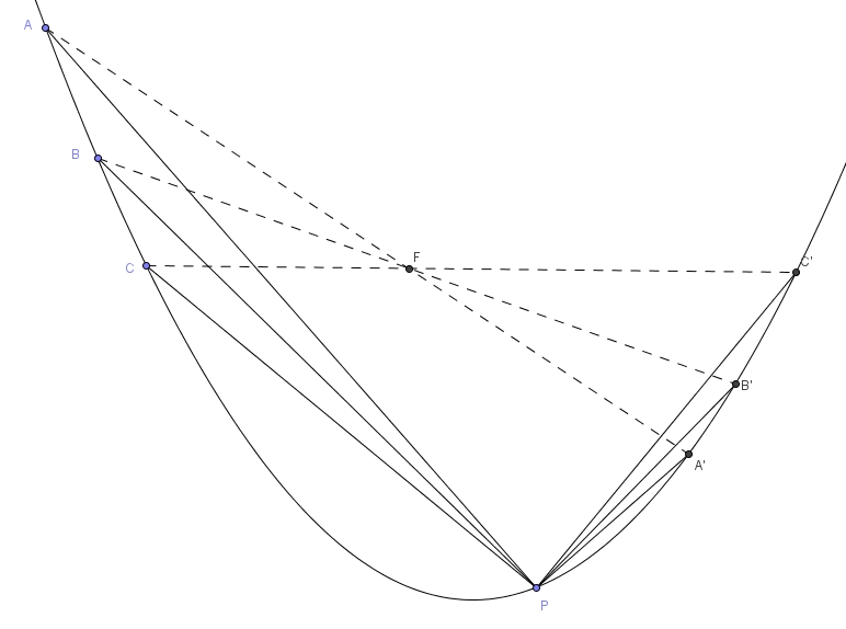 Ne trouvant que peu d’information sur ce théorème, j’ai décidé d’entreprendre une petite démonstration dans le cas de la parabole. Il existe des techniques en géométrie projective qui permettent de démonter le théorème de manière plus générale. Ici, nous n’utiliserons que des techniques de géométrie analytique élémentaire (qu’on verrait en quatrième secondaire par exemple) et porterons notre attention sur la parabole seulement. La géométrie analytique ne fait pas dans l’élégance, mais elle a l’avantage de bien fonctionner, sans surprise. Il suffit d’être un peu rigoureux et attentif lorsqu’on manipule les expressions algébriques. Considérons l’image suivante :