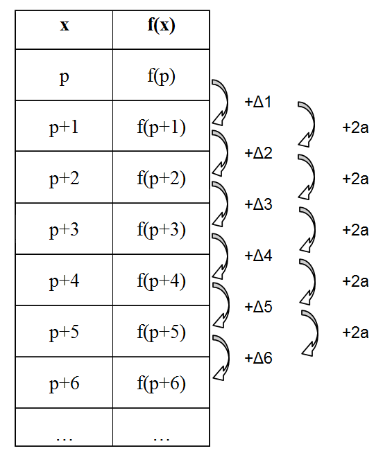 ce qui est équivalent à \begin{align*}f(p)&=f(p) \\ \\ f(p+1) &= f(p) + \Delta_{1} \\ \\ f(p+2) &= f(p) + \Delta_{1}+(\Delta_{1}+2a) \\ \\ f(p+3) &= f(p) + \Delta_{1} + (\Delta_{1}+2a) + (\Delta_{1}+4a) \\ \\ f(p+4)&=f(p)+\Delta_{1}+(\Delta_{1}+2a)+(\Delta_{1}+4a)+(\Delta_{1}+6a) \\ \\ &\dots\end{align*}Le terme général sera donc \[f(x) = f(p) + \Delta_{1}+(\Delta_{1}+2a) + (\Delta_{1}+4a) + \ \dots \ + (\Delta_{1}+(x-p-1)(2a))\]En regroupant les \(\Delta_{1}\) (il y en aura \(x-p\)) \[f(x) = f(p) + (x-p)\Delta_{1}+2a+4a+\ \dots \ + (x-p-1)(2a)\]puis en effectuant la mise en évidence de \(2a\), on obtient \[f(x) = f(p) + (x-p)\Delta_{1}+(2a)(1 + 2 + 3 + \ \dots \ + (x-p-1))\]La somme entre parenthèses est celle des \(x-p-1\) premiers entiers \[f(x) = f(p) + (x-p)\Delta_{1}+(2a)\left(\frac{(x-p-1)(x-p)}{2}\right)\]En développant le produit au numérateur \[f(x) = f(p) + (x-p)\Delta_{1}+ (2a)\left(\frac{p+p^{2}-x-2px+x^{2}}{2}\right)\]et en distribuant le facteur \(2a\) dans la parenthèse, et en effectuant les produits restants, on obtient \[f(x) = f(p) + \Delta_{1}x-\Delta_{1}p + ap + ap^{2}-ax-2apx+ax^{2}\]En réarrangeant les termes, on constate qu’il s’agit bien d’une fonction quadratique \[f(x) = ax^{2}+(\Delta_{1}-a-2ap)x + (f(p) + ap^{2}+ap -\Delta_{1}p)\]dont le coefficient du terme au carré est bien \(a\) !