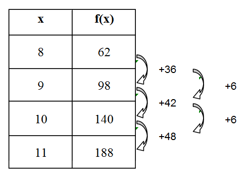 Il est assez facile de montrer que si l’on a une fonction quadratique et qu’en observant sa table de valeurs, il y a des bonds constants du côté de la variable indépendante, alors on observera des bonds entre les bonds constants du côté de la variable dépendante. Et si les bonds constants de la variable indépendante sont de \(1\), et que la règle de la fonction quadratique est \[f(x) = ax^{2}+bx + c\]alors les bonds entre les bonds du côté de la variable dépendante auront une valeur de \(2a\). Un de mes collègues avait une question fort pertinente, c’est-à-dire celle-ci :