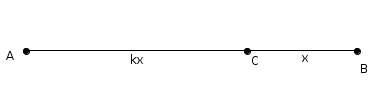 On peut aborder le problème de manière encore plus générale. Quel est le lieu de points \(P\) tel que le rapport des distances entre le point \(P\) et les points \(A\) et \(B\) soit constant ? En d’autres mots, on cherche le lieu de points \(P\) tel que\[\frac{m\overline{PA}}{m\overline{PB}}\ = \ k\]ou de la même manière\[m\overline{PA}\ = \ k\cdot m\overline{PB}\]avec \(A\) et \(B\) donnés. La solution est triviale si \(k=1\) puisque le lieu de points est tout simplement la médiatrice de \(AB\). Si \(k\neq 1\), cependant, la solution est diablement moins évidente. Voyons. On peut toujours trouver un point \(C\) sur \(\overline{AB}\) qui satisfasse ladite condition.