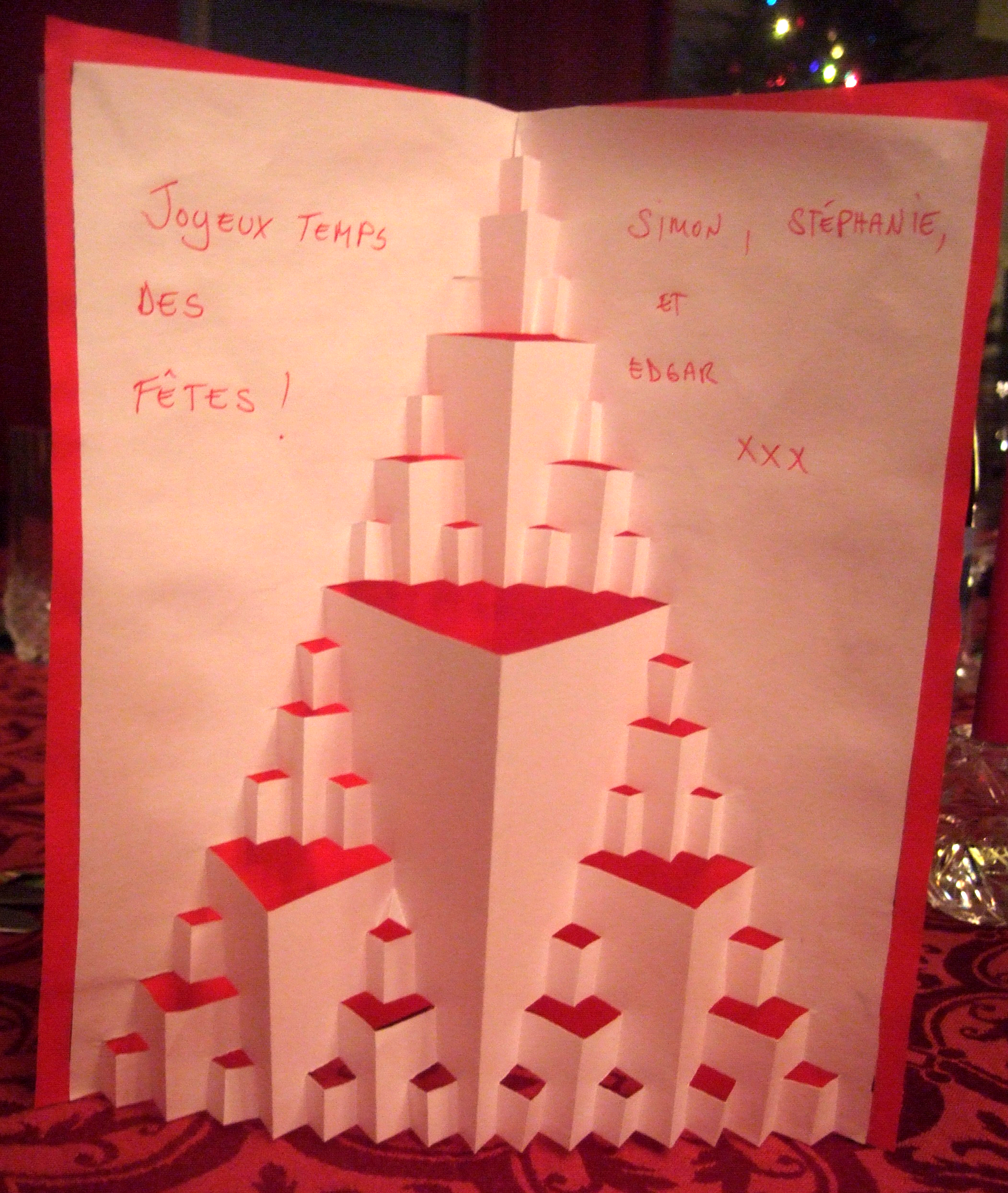 Noël de Sierpiński Posted on 24/12/201224/12/2012 by The Dude Joyeux temps des fêtes chers lecteurs… … avec la carte de Noël fractale ! Il suffit d’un peu de bricolage de dernière minute…