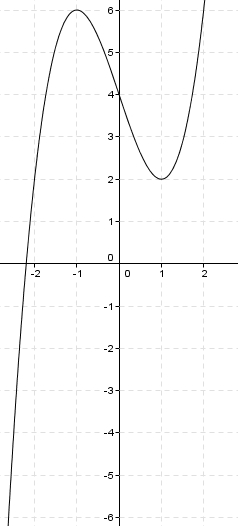 L’étude de cette fonction, sans le terme en \(x^{2}\), est par ailleurs assez facile. La dérivée de cette fonction est \[f'(x) = 3x^{3}+p\]En posant la dérivée égale à \(0\) \[3x^{2}+p=0\]on trouve les abscisses des extrema \[x = \pm\sqrt{-\frac{p}{3}}\]En posant \[a = \sqrt{-\frac{p}{3}}\]comme la racine positive, on peut déduire les résultats suivants. Si \[f(a)<f(-a)<0\]alors la fonction possède un zéro réel et deux zéros complexes. Si \[f(a)<f(-a)=0\]alors la fonction possède deux zéros réels distincts, dont un zéro double. Si \[f(a)<0<f(-a)\]alors la fonction possède trois zéros réels distincts. Si \[0=f(a) < f(-a)\]alors la fonction possède deux zéros réels distincts, dont un zéro double. Enfin si \[0<f(a)<f(-a)\]la fonction possède un zéro réel et deux zéros complexes.