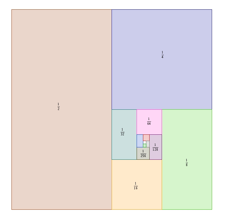 Traçons un rectangle de \(1 \times 1\). Au dessus du rectangle, traçons-en un deuxième de \(1 \times \frac{1}{2}\). Au dessus de ce dernier, au autre rectangle : celui là de \(1 \times \frac{1}{4}\). Et puis après, un autre rectangle de \(1 \times \frac{1}{8}\). Et ainsi de suite. On prétend continuer ce processus sans jamais s’arrêter (pour ce que cela peut bien vouloir dire).
