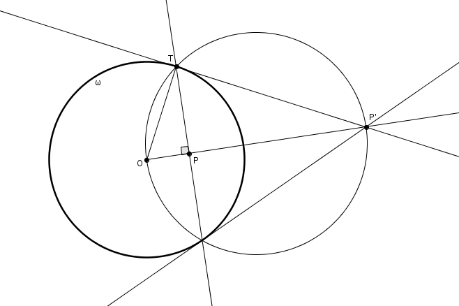En effet, le triangle \(OTP^{\prime}\) étant rectangle (la tangente rencontre perpendiculairement le rayon \(OT\)) et puisque les triangles rectangles \(OPT\) et \(OTP^{\prime}\) sont semblables par le cas de similitude AA, et que la mesure de \(OT\) est égale à celle du rayon \(k\), on a bien \[\frac{m\overline{OP}}{k} =\frac{k}{m\overline{OP^{\prime}}}\]Cette méthode nous permet aussi de trouver l’inverse d’un point \(P\) si \(P\) est à l’extérieur du cercle. On trace la demi-droite \(OP\) et l’une des deux tangentes au cercle passant par \(P\). Cette tangente touche le cercle en \(T\). Le point recherché \(P^{\prime}\) est le pied de la perpendiculaire à \(OP\) passant par \(T\).