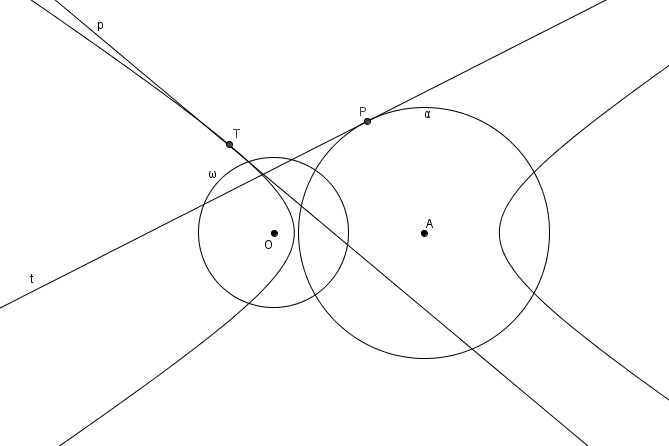 Enfin, si\[\epsilon=\frac{m\overline{OA}}{r}>1\]c’est-à-dire si \(O\) est à l’extérieur de \(\alpha\), alors on a deux tangentes à \(\alpha\), les deux tangentes passant par \(O\), qui n’ont pas de pôle ; cependant les points de tangence de ces tangentes possèdent bel et bien des polaires : ces polaires sont les asymptotes de la courbe obtenue : l’hyperbole.
