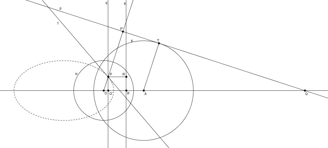Le point \(P\) est le pôle (par rapport au cercle d’inversion \(\omega\)) d’une tangente \(p\) à \(\alpha\) (en \(T\)) qui coupe \(OA\) en \(Q\) et rencontre \(OP\) en \(P^{\prime}\) (l’inverse de \(P\)). La droite directrice \(a\), polaire de \(A\), et la polaire de \(Q\) (notée \(q\)) rencontrent respectivement \(OA\) en \(A^{\prime}\) (l’inverse de \(A\)) et \(Q^{\prime}\) (l’inverse de \(Q\)). On note \(R\) le pied de la perpendiculaire à \(a\) par \(P\). On doit prouver que \[m\overline{OP} = \epsilon \cdot m\overline{PR}\]Si \(Q^{\prime}\) est à gauche de \(O\)