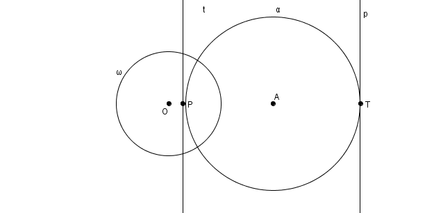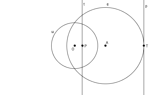 Voici comment il est possible de définir les coniques à l’aide des pôles et polaires. On considère un cercle \(\omega\) de centre \(O\) et de rayon \(k\), et un autre cercle \(\alpha\) de centre \(A\) et de rayon \(r\). Les coniques peuvent être définies par rapport à \(\omega\) à la fois comme un lieu de points, en considérant les pôles \(P\) des tangente \(p\) à \(\alpha\), et à la fois comme une enveloppe de droites, en considérant les polaires \(t\) des points \(T\) sur \(\alpha\). Le rayon \(k\) de \(\omega\) n’affecte pas la forme de la conique mais seulement ses dimensions. En outre, la forme de la conique est déterminée par le rapport\[\epsilon = \frac{m\overline{OA}}{r}\]qu’on appelle excentricité de la conique. Si \[\epsilon = \frac{m\overline{OA}}{r}<1\]c’est-à-dire si \(O\) se trouve à l’intérieur de \(\alpha\), on obtient une figure ovale : l’ellipse. Plus \(\epsilon\) s’approche de \(0\), plus l’ellipse s’apparente à un cercle (à la limite, lorsque \(O\) et \(A\) coïncident, on a \(\epsilon = 0\) et l’image de \(\alpha\) est un cercle) et, au contraire, plus \(\epsilon\) s’approche de \(1\), moins la figure s’apparente à un cercle.