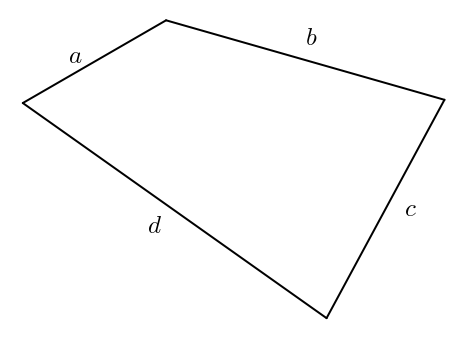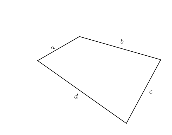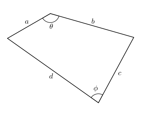 Une fois a, b, c, d et un angle connus, le quadrilatère est entièrement déterminé (le second angle peut être déterminé à l’aide du premier angle et des côtés par deux applications du théorème du cosinus). Je suis arrivé à