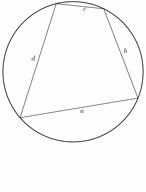 En bonus (bis) ! On peut obtenir facilement la formule de Héron à partir de celle de Brahmagupta. En effet, à partir d’un quadrilatère inscriptible, on fait tendre \(d\) vers \(0\). Le demi-périmètre \[s = \frac{a+b+c+d}{2}\] tend vers \[s = \frac{a+b+c}{2}\] et l’aire du quadrilatère \[K = \sqrt{(s-a)(s-b)(s-c)(s-d)}\]tend bien sûr vers \[K = \sqrt{s(s-a)(s-b)(s-c)}\]Voilà !