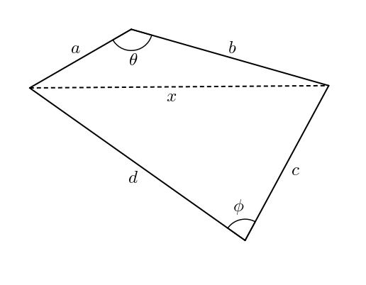 \[x^{2} = a^{2} + b^{2}-2ab\cos(\theta)\] et \[x^{2} = c^{2}+d^{2}-2cd\cos(\phi)\]