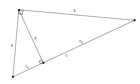En traçant la hauteur issue de l’angle droit (ou relative à l’hypoténuse), le segment \(d\) sur la figure, on crée des triangles semblables. En considérant le grand triangle rectangle initial et un des deux plus petits triangles rectangles semblables, il nous est possible d’établir cette proportion \[\frac{c}{d} = \frac{b}{d}\]ou de manière équivalente \[c = \frac{ab}{d}\]En élevant au carré on obtient \[c^{2} = \frac{a^{2}b^{2}}{d^{2}}\]ce qui nous permet de remplacer dans l’équation initiale\[a^{2} + b^{2} = \frac{a^{2}b^{2}}{d^{2}}\]En divisant par \(a^{2}b^{2}\) on obtient \[\frac{a^{2}}{a^{2}b^{2}} + \frac{b^{2}}{a^{2}b^{2}}=\frac{1}{d^{2}}\]ce qui fait après simplifications \[\frac{1}{a^{2}} + \frac{1}{b^{2}} = \frac{1}{d^{2}}\]C’est l’équation du dernier billet lorsque l’exposant vaut \(-2\). On pose donc \[a = 2pq\left(p^{2}+q^{2}\right), \quad b=\left(p^{2}+q^{2}\right)\left(p^{2}-q^{2}\right), \quad d = 2pq\left(p^{2}-q^{2}\right)\]avec \(p\) et \(q\) deux entiers premiers entre eux et de parité différente, et \(p>q\). Comme\[c = \frac{ab}{d}\]on a bien \[c=\frac{2pq\left(p^{2}+q^{2}\right) \cdot \left(p^{2}+q^{2}\right)\left(p^{2}-q^{2}\right)}{2pq\left(p^{2}-q^{2}\right)} = \left(p^{2}+q^{2}\right)^{2}\]et \(c\) est un entier ! On peut même trouver que la mesure des segments sur l’hypoténuse déterminés par la hauteur (\(c_1\) et \(c_2\) sur la figure) sont elles aussi entières. Par Pythagore, on a \begin{align*}\left(c_{1}\right)^{2}+d^{2} &= a^{2} \\ \\ \left(c_{1}\right)^{2} + \left(2pq\left(p^{2}-q^{2}\right)\right)^{2} &=\left(2pq\left(p^{2}+q^{2}\right)\right)^{2} \\ \\ \left(c_{1}\right)^{2} &= \left(2pq\left(p^{2}+q^{2}\right)\right)^{2}-\left(2pq\left(p^{2}-q^{2}\right)\right)^{2}\end{align*}et en effectuant une mise en évidence simple puis en factorisant la différence de carrés, on trouve\begin{align*}\left(c_{1}\right)^{2} &=\left(2pq\left(p^{2}+q^{2}\right)\right)^{2}-\left(2pq\left(p^{2}-q^{2}\right)\right)^{2} \\ \\ &=4p^{2}q^{2}\left(\left(p^{2}+q^{2}\right)^{2}-\left(p^{2}-q^{2}\right)^{2}\right) \\ \\ &= 4p^{2}q^{2}\left(p^{2}+q^{2}+\left(p^{2}-q^{2}\right)\right)\left(p^{2}+q^{2}-\left(p^{2}-q^{2}\right)\right) \\ \\ &= 4p^{2}q^{2}\left(2p^{2}\right)\left(2q^{2}\right) \\ \\ &= \left(4p^{2}q^{2}\right)^{2}\end{align*}c’est-à-dire\[c_{1}=4p^{2}q^{2}\]un nombre entier ! Puis la même chose avec \begin{align*}\left(c_{2}\right)^{2} + d^{2} &=b^{2} \\ \\ \left(c_{2}\right)^{2} + \left(2pq\left(p^{2}-q^{2}\right)\right)^{2}&=\left(\left(p^{2}+q^{2}\right)\left(p^{2}-q^{2}\right)\right)^{2} \\ \\ \left(c_{2}\right)^{2}&=\left(\left(p^{2}+q^{2}\right)\left(p^{2}-q^{2}\right)\right)^{2}-\left(2pq\left(p^{2}-q^{2}\right)\right)^{2}\end{align*}et encore une fois après une mise en évidence simple et une factorisation d’une différence de carrés, on a \begin{align*}\left(c_{2}\right)^{2}&=\left(\left(p^{2}+q^{2}\right)\left(p^{2}-q^{2}\right)\right)^{2}-\left(2pq\left(p^{2}-q^{2}\right)\right)^{2} \\ \\ &=\left(p^{2}-q^{2}\right)^{2}\left(\left(p^{2}+q^{2}\right)^{2}-\left(2pq\right)^{2}\right) \\ \\ &=\left(p^{2}-q^{2}\right)^{2}\left(p^{2}+q^{2}+2pq\right)\left(p^{2}+q^{2}-2pq\right) \\ \\ &=\left(p^{2}-q^{2}\right)^{2}\left(p+q\right)^{2}\left(p-q\right)^{2}\end{align*}c’est-à-dire \begin{align*}c_{2}&=\left(p^{2}-q^{2}\right)\left(p+q\right)\left(p-q\right) \\ \\ &=\left(p^{2}-q^{2}\right)\left(p^{2}-q^{2}\right)\end{align*}encore un nombre entier ! Pourquoi arrêter le plaisir ? On peut même vérifier que \begin{align*}c_{1}+c_{2} &= 4p^{2}q^{2}+\left(p^{2}-q^{2}\right)^{2} \\ \\ &=4p^{2}q^{2}+p^{4}-2p^{2}q^{2}+q^{4} \\ \\ &=p^{4}+2p^{2}q^{2}+q^{4} \\ \\ &= \left(p^{2}+q^{2}\right)^{2} \\ \\ &=c\end{align*}Tout fonctionne ! C’est un truc pratique pour tout enseignant voulant que les solutions à son exercice sur les relations métriques dans le triangle rectangle soient « arrangées avec le gars des vues ».