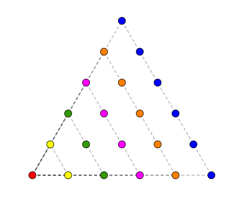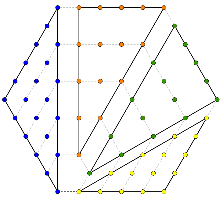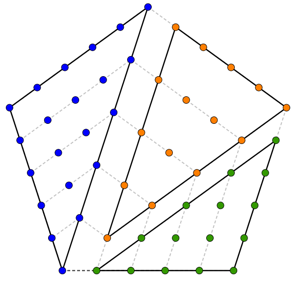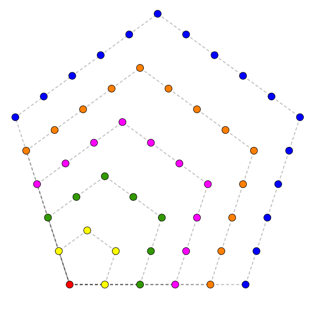 nous permet d’obtenir \[h_{n} = t_{n} + 3t_{n-1}\]Puisque le \(k-\)gone se divisera en \(k-2\) triangles, on trouve \[\pi_{(k,n)} = t_{n} + (k-3)t_{n-1}\]c’est-à-dire un triangle de \(t_{n}\) et \(k-3\) triangles de \(t_{n-1}\) ce qui fait \(k-2\) triangles au total. En se rappelant que \[t_n = \frac{n(n+1)}{2}\]la relation précédente nous permet de trouver une expression générale pour le \(n^{\text{e}}\) nombre \(k-\)gonal.\begin{align*}\pi_{(k,n)} &= t_{n} + (k-3)t_{n-1} \\ \\ &= \frac{n(n+1)}{2} + (k-3)\frac{(n-1)(n)}{2} \\ \\ &= \frac{n^2 + n}{2} + (k-3)\frac{n^{2}-n}{2} \\ \\ &= \frac{n^2 + n + (k-3)(n^{2}-n)}{2} \\ \\ &= \frac{n^2 + n + kn^2-3n^{2}-kn + 3n}{2} \\ \\ &=\frac{(k-2)n^{2}-(k-4)n}{2}\end{align*}