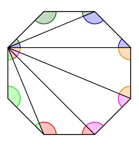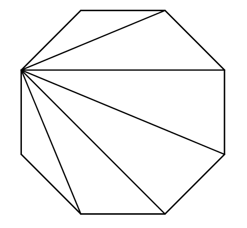 Les diagonales divisent le polygone en triangles. Puisqu’on ne peut relier un sommet à lui-même ni aux deux sommets qui lui sont adjacents, dans un polygone à \(n\) côtés, il y a \(n-3\) diagonales qui divisent le polygone en \(n-2\) triangles.
