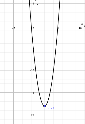 Le sommet de la parabole est donc en \((2, \, -18)\) et la parabole est ouverte vers le haut car \(a>0\). On peut ensuite calculer les zéros et l’ordonnée à l’origine pour un peu plus de précision.