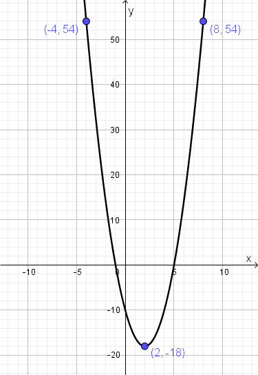 Alternative : Nul besoin de compléter le carré ! [4] Clairement, on voit en examinant l’équation sous cette forme\[y =2(x-8)(x+4)+54\]que \[f(8) = f(-4) = 54\]Puisque la parabole possède un axe de symétrie qui passe par son sommet, les points \((8, \, 54)\) et \((-4, \, 54)\) sont situés à la même distance de part et d’autre de cet axe. On peut déduire l’abscisse du sommet est \[\frac{8 + (-4)}{2} = 2\]L’ordonnée du sommet est donnée par \begin{align*}y &= 2(2-8)(2+4)+54 \\ \\ &=2(-6)(6) + 54 \\ \\ &=-72 + 54 \\ \\ &=-18\end{align*}La parabole a pour sommet \((2, \, -18)\) et elle est ouverte vers le haut ; en prime, on sait qu’elle passe par \((8, \, 54)\) et \((-4, \, 54)\). On peut calculer l’ordonnée à l’origine facilement pour plus de précision.